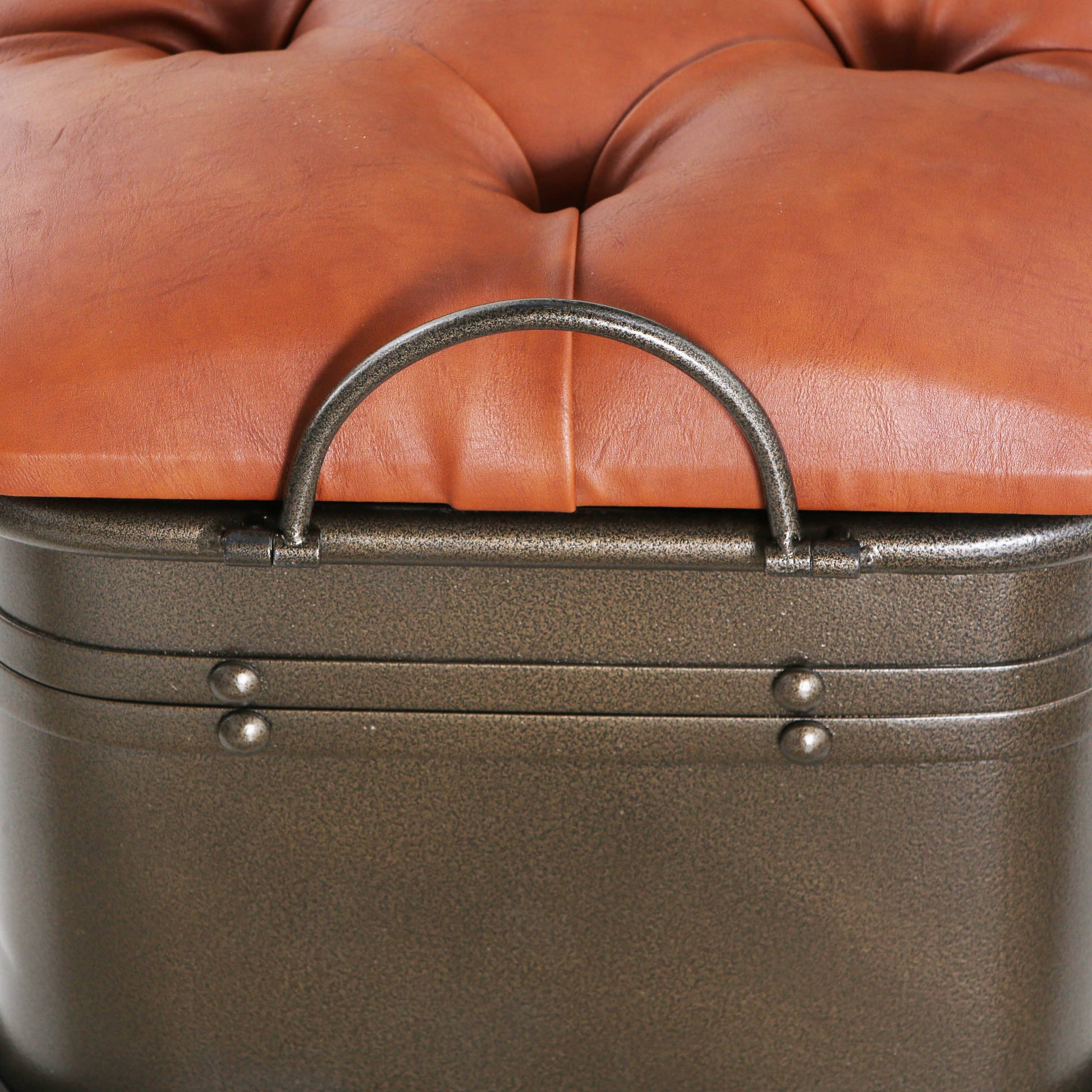 The luxury and shine of faux leather blended with bronzed metal! Inspired by the raw materials of leather and bronze, this storage bench brings the beauty of masculine industrial style to your home. A plush faux leather cushion adds softness, shine, and dimension, while the distressed bronzed metal base adds the ruggedness. Snapping hinge details add style. Open the plush top to reveal storage space, perfect for blankets, magazines or coats. Metal legs on the base add height and strength, while metal handles and grommets along the base allow for easy, convenient movement. Add a little industrial chic to your home with this rugged storage bench.
