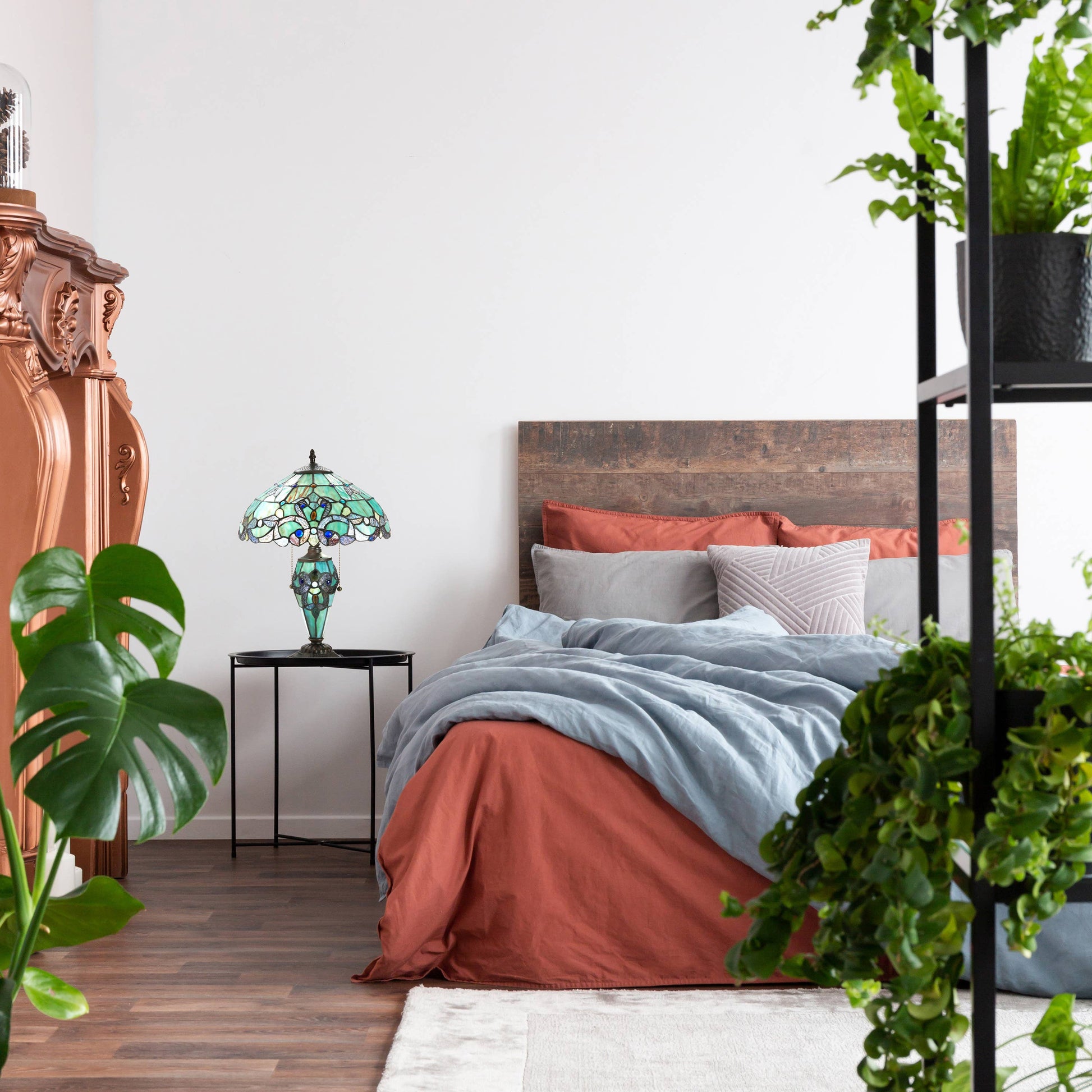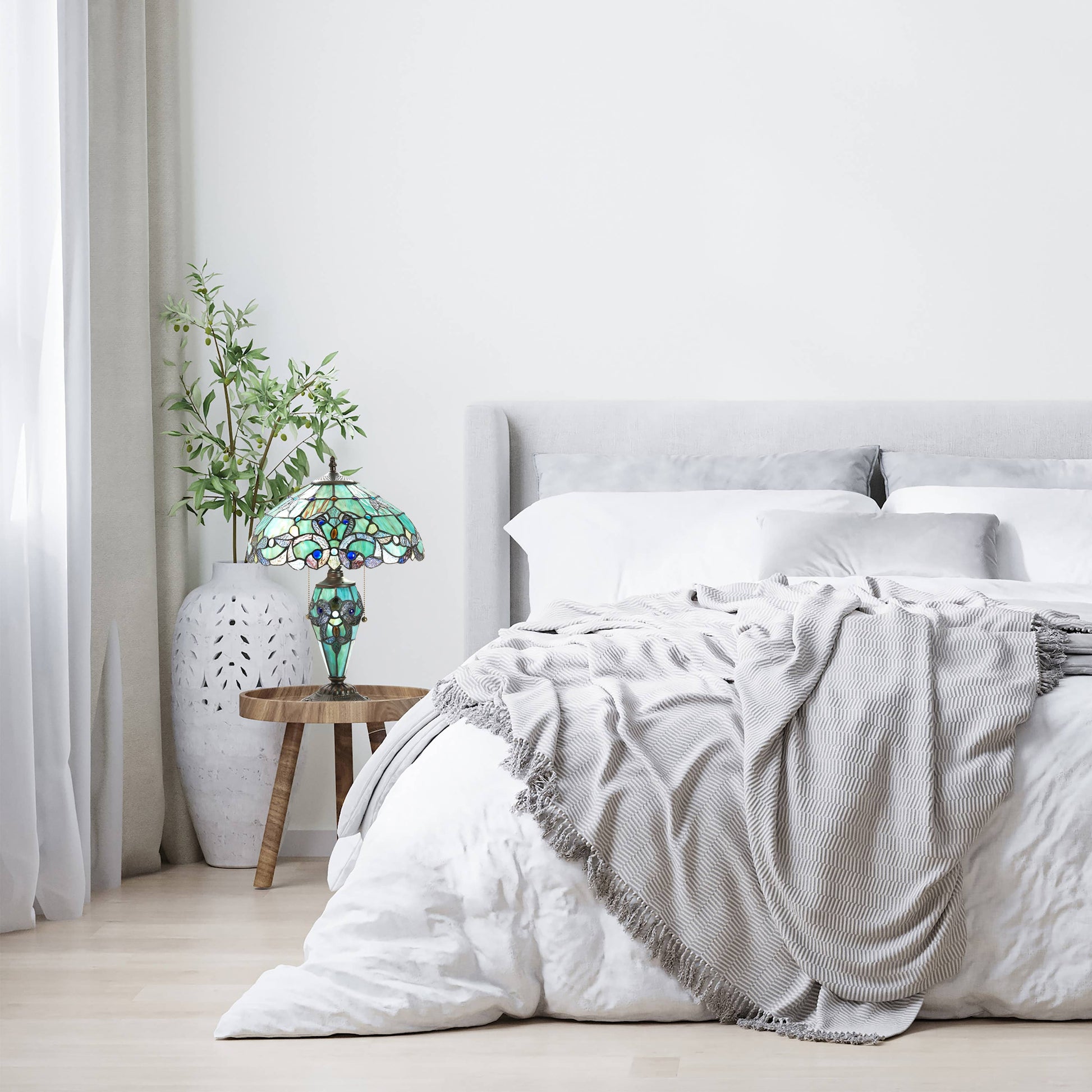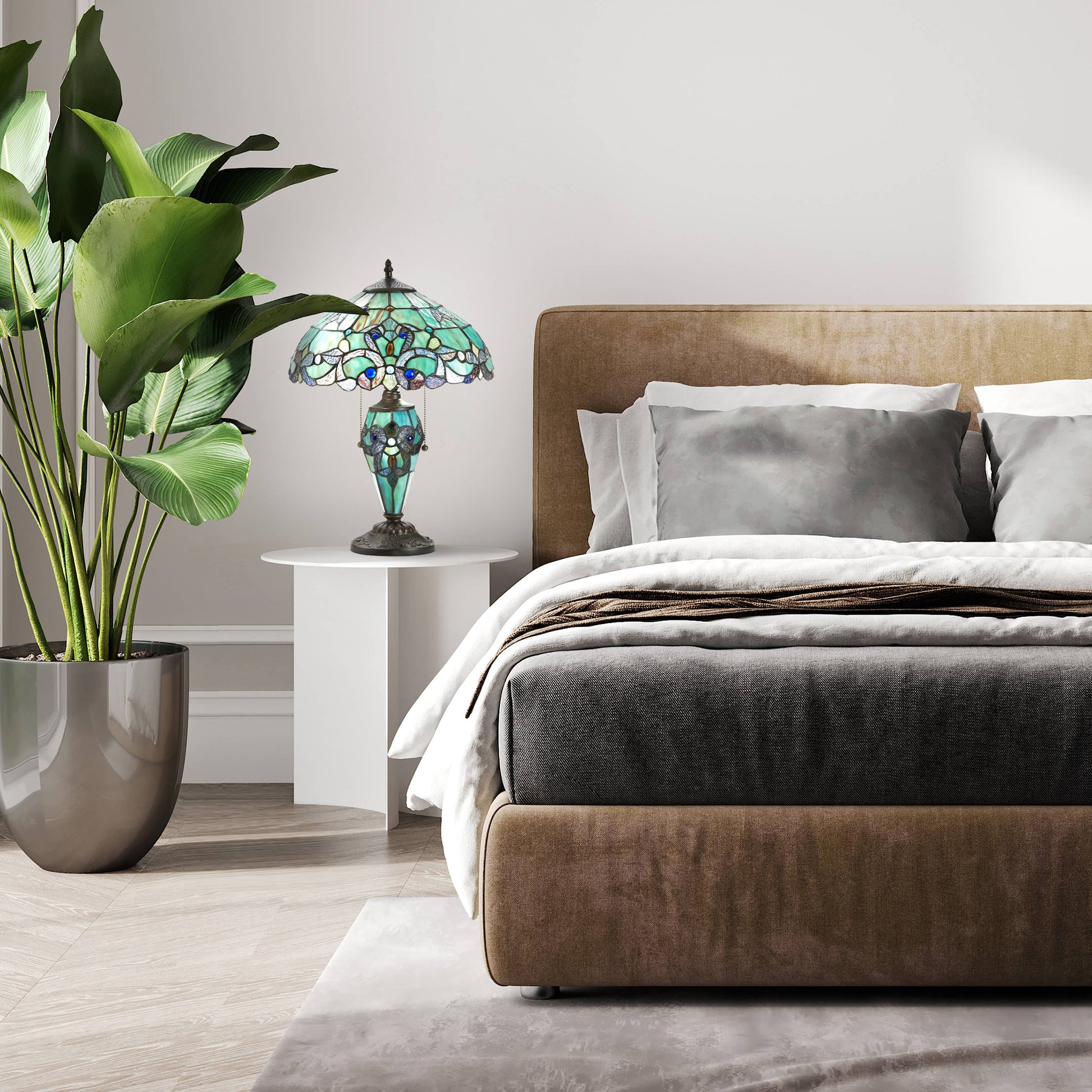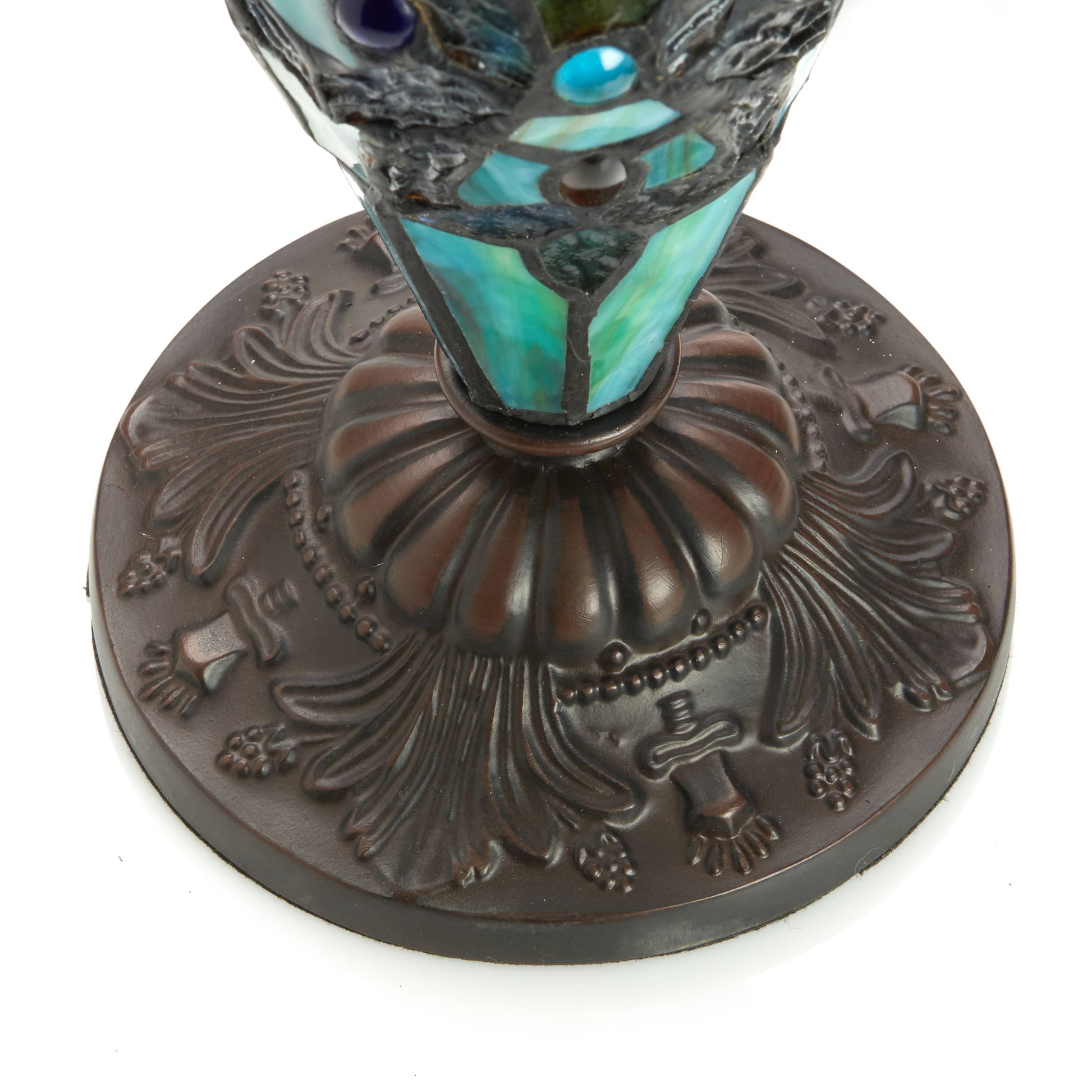 Classic Style! This 20"H Green Magna Carta Stained Glass Double Lit Table Lamp is sure to add the perfect touch to any décor. It is handcrafted with 245 pieces of glass and 50 cabochons. The double lit option provides both functional and ambiance lighting.